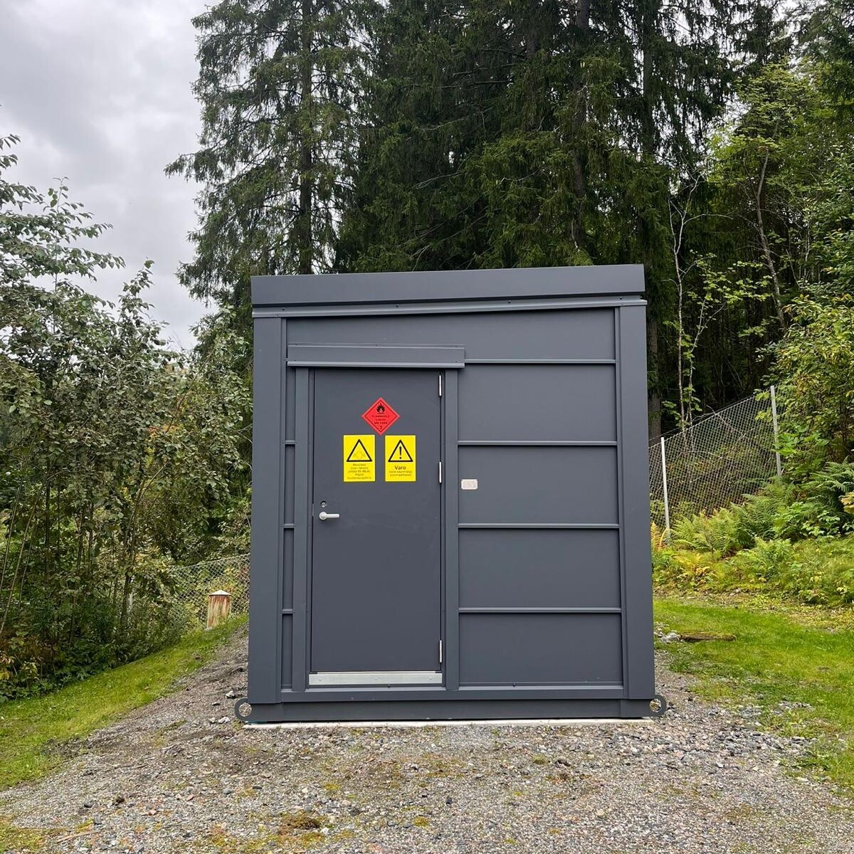 Kuusimetrinen varavoimakontti on merikonttiin verrattuna kevytrakenteinen. Sandwich-rakenteinen peltikuori maalattiin asiakkaan toiveiden mukaan, ja vino pulpettikatto istuu maastonmuotoihin.